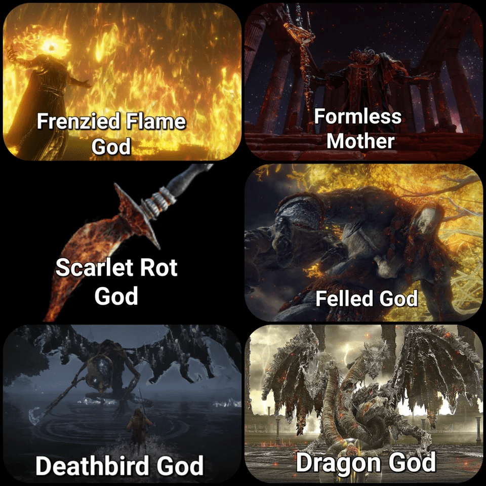 The important thing to take from all of this is that life DID exist before the introduction of the greater will, before the elden beast, before the ring. Other gods ruled factions of the lands between like a divided nation. Some gods we know as canon in the game are ones like The Frenzied Flame, The God of Scarlet Rot and The Formless Mother. Some of them we know because we get to follow their storylines and see them in a limited capacity (Like the Frenzied Flame) and others we fight their vessels or chosen champions (Like Melania, avatar of the Scarlet Rot). We also have outer gods like the Dark Moon or the One-eyed God of Fire. Outer Gods with very real presence in the game, yet whom compare to others we know frighteningly little about.
